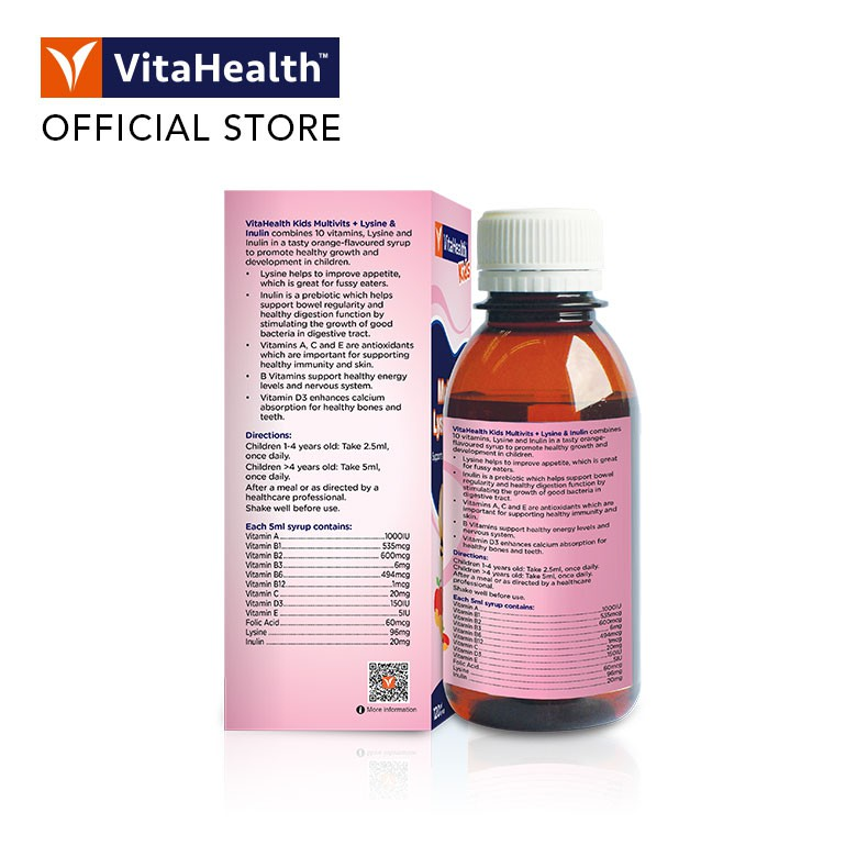 VitaHealth Kids Multivits + Lysine & Inulin is a comprehensive, orange-flavoured nutritional syrup which fills the nutritional gaps in growing children, enabling them to achieve their peak performance.